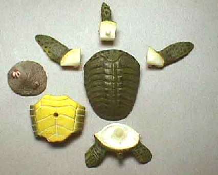 フルタ製菓梶@幻の「ダイノモデルス第二弾」 アーケロン やっぱり、私の様な、恐竜のオールドファンにはこの大亀は外せません!もちろんラインナップに入ってました。 もう、去年の段階で、ここまで、量産用の分割、製品化体制でしたが・・・。ワー!まるで、解体されたスッポンみたい!