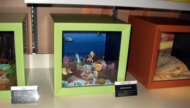 | 2階は広い展示ルーム。食玩をふんだんに使った、ジオラマボックスが大小200以上! | これはガレージキットと食玩を使った、大型のボックス |