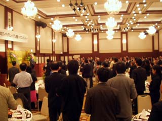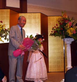 | プレオープンの際、ホテルで行われたパーティー | お孫さんに花束を贈られ、嬉しそうな館長 |